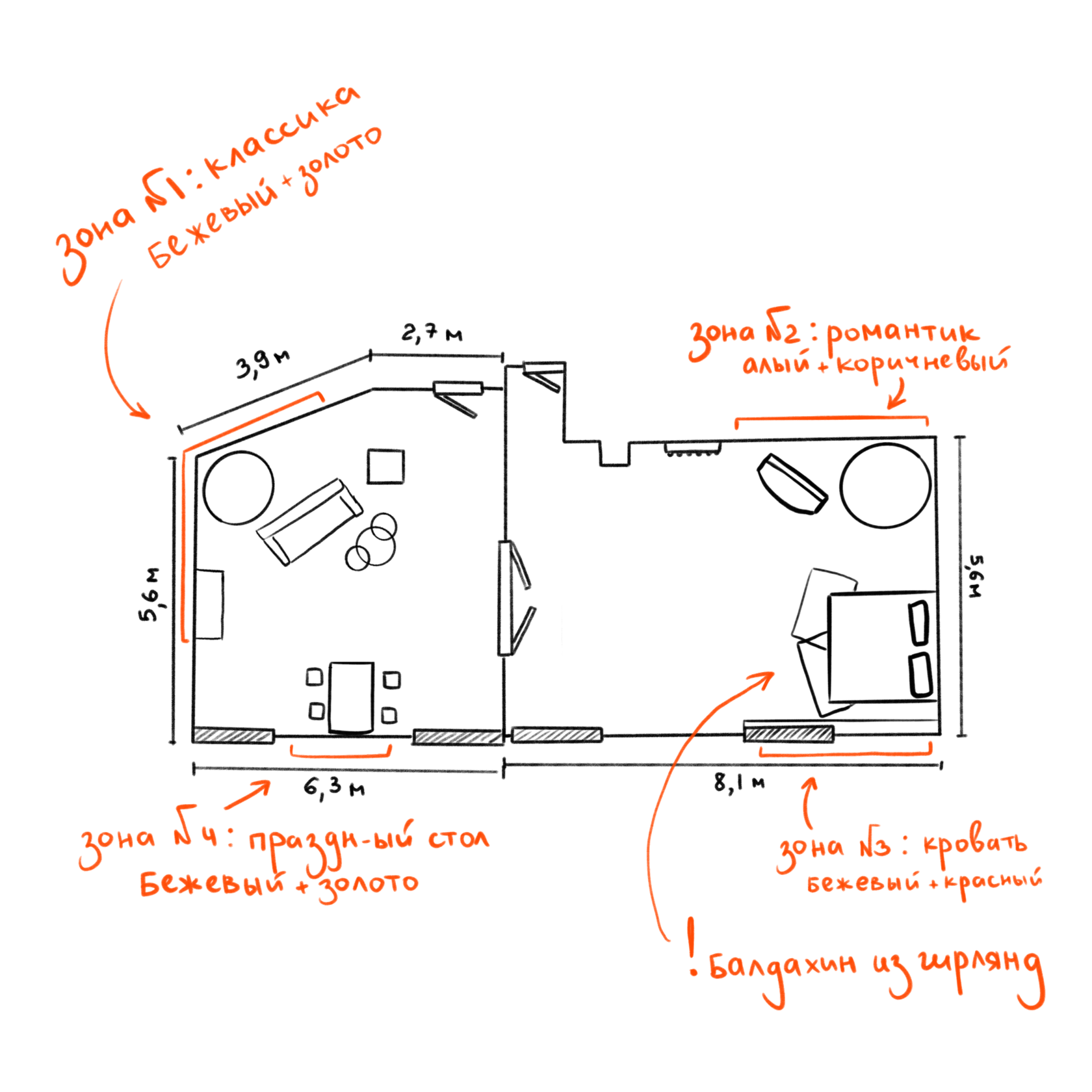 Самый большой зал в нашей студии - 100 кв м, которые разделены на две локации. В первой зоне мы решили сделать классический интерьер в бежевых оттенках. Будет новогодняя зона с диваном и камином, а в другой стороне - праздничный стол.