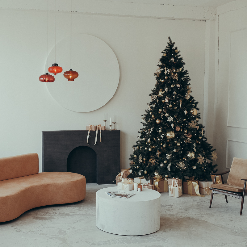 В этом году мы отошли от классического декора и шагнули в сторону современной стилистики. Округлая мебель, геометричные формы, массивные элементы, которые лаконично вписываются в интерьер. Добавим к этому новогодний декор и получим зал для создания самых стильных кадров.