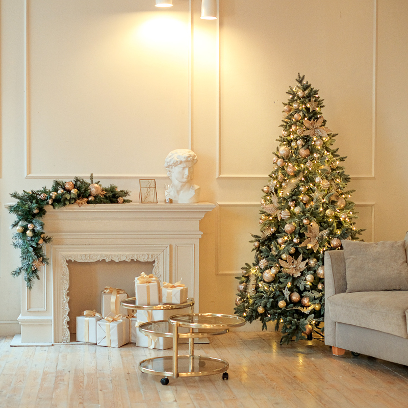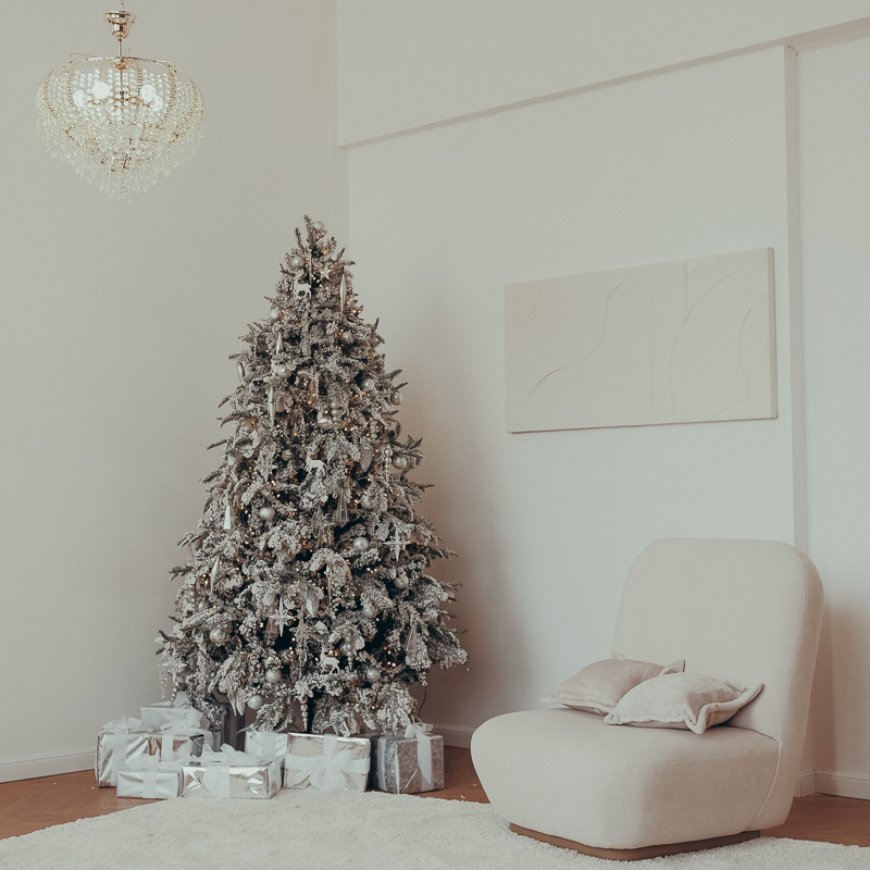 В этом зале мы решили создать легкую и воздушную новогоднюю стилистику за счет светлого декора, мягкой текстуры мебели и белой ёлки с хрустальными украшениями.